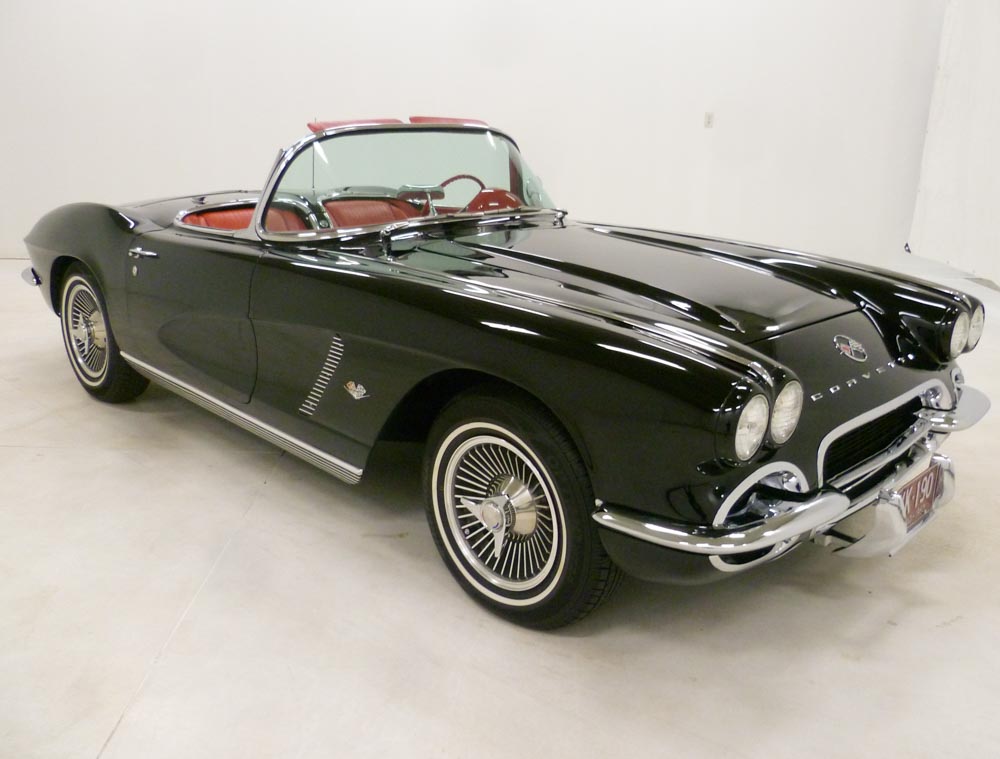 NSN-TB..1962 Corvette Convertible, 327-340 hp with numbers matching T-10 4-speed transmission and May 1964 #2870 replacement block stamped F0820RE, 73,816 actual miles. Tuxedo Black paint with Roman Red interior and White soft top. 2005-2009 body-on restoration in excellent condition with 1963-'66 style reproduction aluminum knockoff wheels. Optioned with T-10 transmission, posi, Wonderbar radio, sunvisors, windshield washers, courtesy light, heater,seat belts, 1963-66 style repro-K.O. aluminum wheels and white stripe radial tires. Most all factory correct type components including the spare, jack, jack tools, trunk mat, trunk liner, taillight cones, rebound straps, washer system, shifter, shielding, air cleaner, spark plug shields, hoses, hose clamps, #3269S carb, #5397 intake manifold, 6-quart oil pan, and finned balancer. Documented with some owner history, previous owner title, restoration receipts ($20,929.00), maintenance receipts ($11,435.00), and 3-ring binder. From past owner of 12 years. Looks, runs, and drives excellent. CC:2 $80,000.00